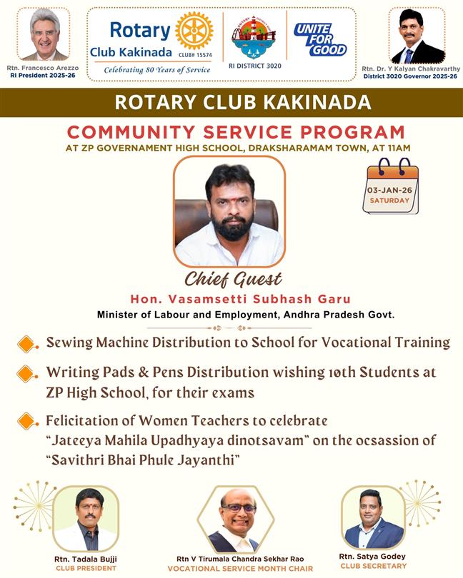 Rotary Club of Kakinada, led by President Rtn. Tadala Bujji Garu, i. . .